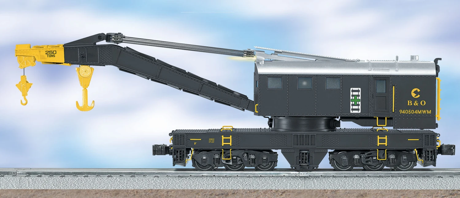 Pull this die-cast metal workhorse into place and take complete command of M.o.W. operations anywhere on your layout. Equipped with the TrainMaster Command Control system, this new crane car offers full remote control operation from the boom to the hooks to the outriggers. Add the matching boom car for one of the most realistic experiences in O gauge.